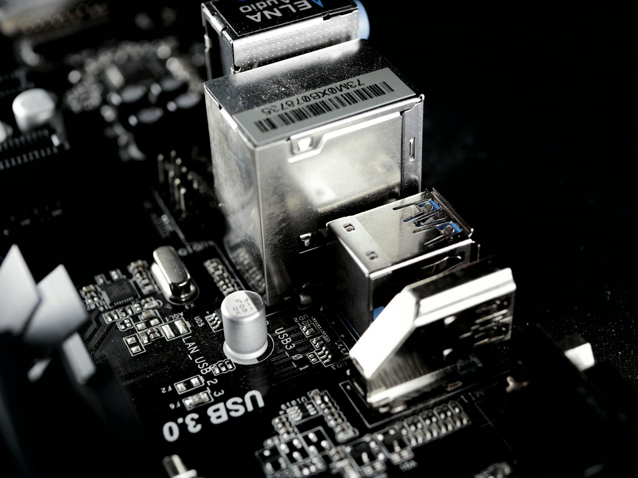 Detailed view of a circuit board featuring USB ports and electronic components.